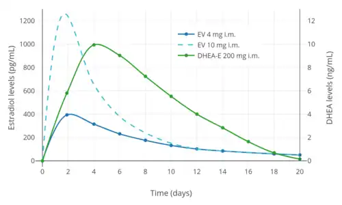 Levels of DHEA peak at about 9 ng/mL within 1 to 4 days of an injection of prasterone enanthate.[1] Subsequently, DHEA levels return to baseline by about 18 days following the injection.[1] Prasterone enanthate has an elimination half-life of about 9 days.[1] The plasma half-life of DHEA/prasterone enanthate following an intravenous injection is about 44 minutes.[1] The half-lives of DHEA metabolites range up to 3.6 days.[1]
