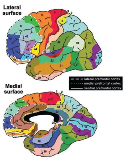 ![]() Brodmann areas, 8, 9, 10, 11, 12, 13, 14, 24, 25, 32, 44, 45, 46, and 47 are all in the prefrontal cortex[1] | |