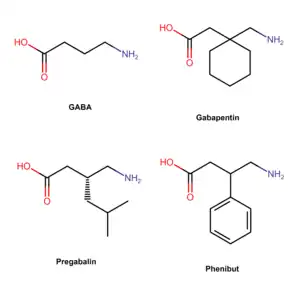 Pregabalin is a GABA analogue that is a 3-substituted derivative as well as a γ-amino acid.[86][67] Specifically, pregabalin is (S)-(+)-3-isobutyl-GABA.[87][88][89] Pregabalin also closely resembles the α-amino acids L-leucine and L-isoleucine, and this may be of greater relevance in relation to its pharmacodynamics than its structural similarity to GABA.[73][74][87]