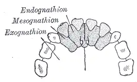 ![]() The bony palate and alveolar arch. (Premaxilla is not labeled, but region is visible.) | |