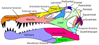 ![]() Skull of Spinosaurus aegyptiacus, premaxilla in orange | |