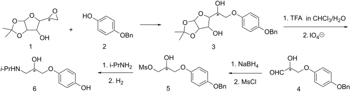 - ↑ DE 2503968, Jaeggi KA, Schröter H, Ostermayer F, "Optisch aktive Derivate des 1-Phenoxy-2-hydroxy-3-aminopropan und Verfahren zu ihrer Herstellung [Optically active derivatives of 1-phenoxy-2-hydroxy-3-aminopropane and the process for their production]", published 1975-08-14, assigned to Ciba-Geigy AG Chem. Abstr. 84, 5322 (1976).