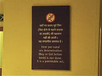 Prenatal sex determination was banned in India in 1994, under the Pre-Conception and Pre-Natal Diagnostic Techniques Act, 1994.[6] The act aims to prevent sex-selective abortion, which, according to the Indian Ministry of Health and Family Welfare, "has its roots in India's long history of strong patriarchal influence in all spheres of life". Prenatal sex determination has caused the child sex ratio to go down at alarming rates, in India, which is also another factor that led to its banning.[7] However, the Supreme Court of India has accused the Government of India of poor implementation and enforcement of the act.[8] Over time, there has been a substitution effect of more families participating in pre-natal sex determination instead of the previously popular act of female foeticide.