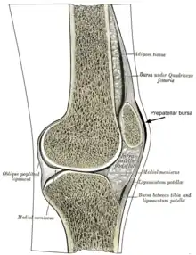 In human anatomy, a bursa is a small pouch filled with synovial fluid. Its purpose is to reduce friction between adjacent structures. The prepatellar bursa is one of several bursae of the knee joint, and is located between the patella and the skin.[12] Prepatellar bursitis is an inflammation of this bursa. Bursae are readily inflamed when irritated, as their walls are very thin.[11]: p. 22 Along with the pes anserine bursa, the prepatellar bursa is one of the most common bursae to cause knee pain when inflamed.[13]