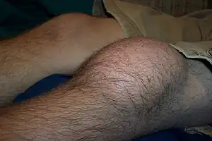| Aseptic prepatellar bursitis of the knee near the camera | |