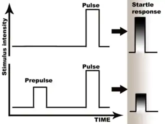 Prepulse inhibition (PPI) is a neurological phenomenon in which a weaker prestimulus (prepulse) inhibits the reaction of an organism to a subsequent strong reflex-eliciting stimulus (pulse), often using the startle reflex. The stimuli are usually acoustic, but tactile stimuli (e.g. via air puffs onto the skin)[1] and light stimuli[2] are also used. When prepulse inhibition is high, the corresponding one-time startle response is reduced.