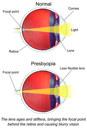 Presbyopia is a normal part of the aging process.[1] It occurs due to hardening of the lens of the eye, causing the eye to focus light behind rather than on the retina when looking at close objects.[1] It is a type of refractive error along with nearsightedness, farsightedness, and astigmatism.[1] Diagnosis is by an eye examination.[1]