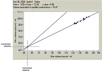 To take into account the parallel conductance, GP, the most common method involves injection of hypertonic saline into the subject—enough to temporarily reduce blood resistance, and therefore increase preload, but not so much as to alter haemodynamics. The minimum and maximum volumes (Vmax and Vmin) from each loop in the series of loops are plotted on a graph. Vmax and Vmin lines are extrapolated and at their point of intersection, where Vmax is equal to Vmin, must be zero—conductance is parallel conductance only. The volume at this point is the correction volume.