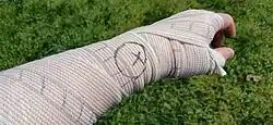 An elastic or firm bandage is wound firmly around the limb in overlapping turns, starting at the fingers or toes of the affected limb and continuing as far up the limb as possible to apply pressure. The pressure of the bandage should be firm enough that the first aider's finger cannot slide underneath, but not so tight that it cuts off circulation to the hand/foot. This can be tested by lightly pinching or pressing a toe or finger until it blanches white, then when the press/pinch is stopped, pinkness should return within seconds. Some swelling of the hand/foot is expected. A specialised snake bite bandage with indicators is commonly used for this.[5][6]