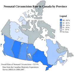 A survey of Canadian maternity practices conducted in 2006/2007, and published in 2009 by the national public health agency, found a newborn circumcision rate of 31.9%.[40] Rates varied markedly across the country, from close to zero in Newfoundland and Labrador to 44.3% in Alberta and 43.7% in Ontario. In 2015, the Canadian Paediatric Society used those statistics in determining the national circumcision rate it currently quotes.[40][46]