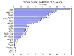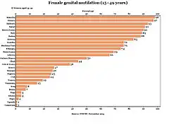 In a 2013 UNICEF report covering 29 countries in Africa and the Middle East, Egypt had the region's highest total number of women that have undergone FGM (27 million), while Somalia had the highest percentage (prevalence) of FGM (98%).[11]