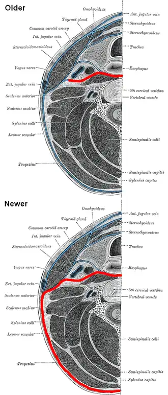 ![]() Prevertebral fascia labeled in red, both according to older literature (e.g. Gray's) and newer literature