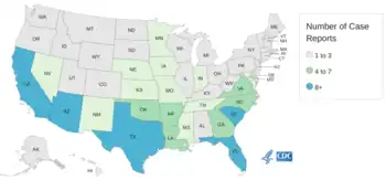 A single case has been reported in Japan as of 2018; occurring in 1996.[8] As of 2023 it has not been found in Canada.[42]