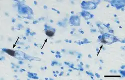 The striatopallidonigral connection is a very particular one. It engages the totality of spiny striatal axons. Estimated numbers are 110 million in man, 40 in chimpanzees and 12 in macaques.[33][17] The striato-pallido-nigral bundle is made up of thin, poorly myelinated axons from the striatal spiny neurons grouped into pencils "converging like the spokes of a wheel" (Papez, 1941). It gives its "pale" aspect to the receiving areas. The bundle strongly stains for iron using Perls' Prussian blue (in addition to iron it contains many heavy metals including cobalt, copper, magnesium and lead).