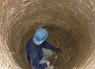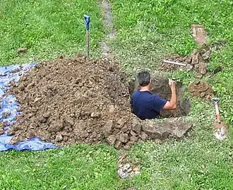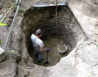 Privy digging is the process of locating and investigating the contents of defunct outhouse vaults. The purpose of privy digging is the salvage of antique bottles and everyday household artifacts from the past. Privy digging is a form of historical digging and is often conducted on private residential properties. Construction sites and major developments around older areas of towns and cities are also likely places to look for evidence of privies.