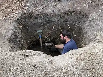 Test digging involves making a small hole, and going down a few feet, to determine that a probe reading is accurate. Once something other than dirt and rocks are being encountered and man-made objects are buried deeply in a particular spot, the outline of the privy is carefully excavated. This can take hours or days depending on its size and the materials being dug through. Dug dirt or “fluff” as it is sometimes called, is systematically removed from the hole by shoveling. Deeper holes require a rope and bucket setup and sometimes a tripod mechanism to assist with the removal of material.