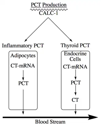PCT is located on the CALC-1 gene on chromosome 11.[9] Bacterial infections induce a universal increase in the CALC-1 gene expression and a release of PCT (>1 μg/mL).[11] Expression of this hormone occurs in a site specific manner.[9] In healthy and non-infected individuals, transcription of PCT only occurs in neuroendocrine tissue, except for the C cells in the thyroid. The formed PCT then undergoes post-translational modifications, resulting in the production small peptides and mature CT by removal of the C-terminal glycine from the immature CT by peptidylglycine α-amidating monooxygenase (PAM).[12] In a microbial infected individual, non-neuroendocrine tissue also secretes PCT by expression of CALC-1. A microbial infection induces a substantial increase in the expression of CALC-1, leading to the production of PCT in all differentiated cell types.[13] The function of PCT synthesized in nonneuroendocrine tissue due to a microbial infection is currently unknown, but, its detection aids in the differentiation of inflammatory processes.[9]