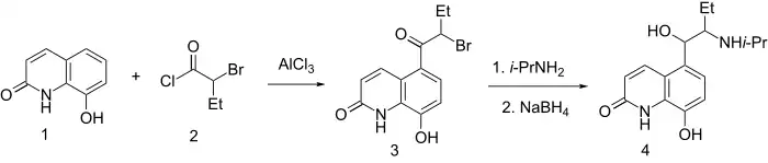 8-Hydroxycarbostyril 1 is acylated with 2-bromobutyric acid chloride 2 at the fifth position of the quinoline system, which gives the compound 3. This undergoes action of isopropylamine, forming an aminoketone, the carbonyl group of which is reduced by sodium borohydride, giving procaterol 4.[3][4][5][6]