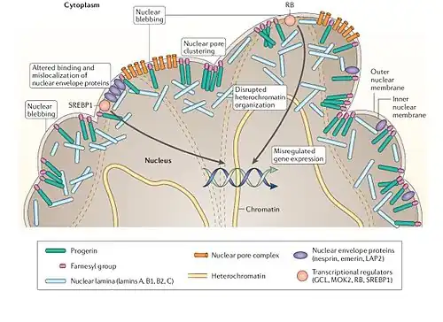 - 1 2 Goldman, RD; Shumaker, DK; Erdos, MR; Eriksson, M; Goldman, AE; Gordon, LB; Gruenbaum, Y; Khuon, S; et al. (2004). "Accumulation of mutant lamin a causes progressive changes in nuclear architecture in Hutchinson–Gilford progeria syndrome". Proceedings of the National Academy of Sciences of the United States of America. 101 (24): 8963–8. Bibcode:2004PNAS..101.8963G. doi:10.1073/pnas.0402943101. PMC 428455. PMID 15184648.