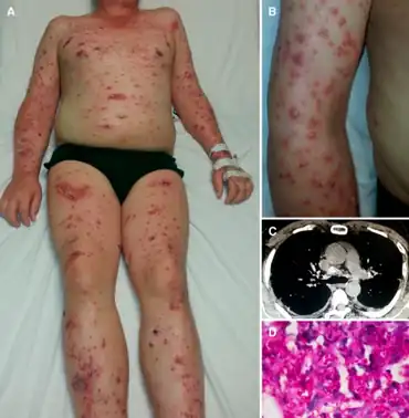 Progressive disseminated histoplasmosis is an infection caused by Histoplasma capsulatum, and most people who develop this severe form of histoplasmosis are immunocompromised or taking systemic corticosteroids.[1]: 316 Skin lesions are present in approximately 6% of patients with dissemination.[1]: 316