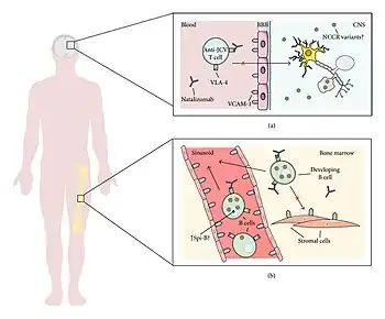 - ↑ 13.0 13.1 13.2 13.3 13.4 13.5 13.6 13.7 Kappos, Ludwig; Bates, David; Edan, Gilles; Eraksoy, Mefkûre; Garcia-Merino, Antonio; Grigoriadis, Nikolaos; Hartung, Hans-Peter; Havrdová, Eva; Hillert, Jan; Hohlfeld, Reinhard; Kremenchutzky, Marcelo; Lyon-Caen, Olivier; Miller, Ariel; Pozzilli, Carlo; Ravnborg, Mads; Saida, Takahiko; Sindic, Christian; Vass, Karl; Clifford, David B; Hauser, Stephen; Major, Eugene O; O'Connor, Paul W; Weiner, Howard L; Clanet, Michel; Gold, Ralf; Hirsch, Hans H; Radü, Ernst-Wilhelm; Sørensen, Per Soelberg; King, John (August 2011). "Natalizumab treatment for multiple sclerosis: updated recommendations for patient selection and monitoring". Lancet Neurology. 10 (8): 745–58. doi:10.1016/S1474-4422(11)70149-1. hdl:2078.1/124907. PMID 21777829. S2CID 15639613.
