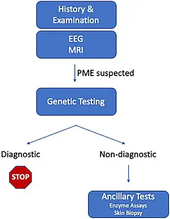 As PME progresses neurological ability decreases and can lead to myopathy, neuropathy, cognitive decline, cerebellar ataxia, and dementia.[5][3] The different symptoms in each of the PME and between individuals makes diagnosis difficult. Therefore, diagnosis of PME is dependent on failure to respond to antiepileptic drugs and therapy but diagnosis of specific PME depends on genetic testing, EEG (electroencephalography), enzyme measurements and more.[5][3][4]