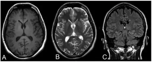 | Progressive myoclonic epilepsy type 1-a,b) MRI c) FLAIR | |