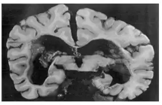 | Coronal section of brain at level of splenium showing ventricular dilation[2] | |