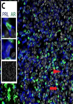 A prolactin cell (also known as a lactotropic cell, epsilon acidophil, lactotrope, lactotroph, mammatroph, mammotroph) is a cell in the anterior pituitary which produces prolactin (a peptide hormone) in response to hormonal signals including dopamine (which is inhibitory), thyrotropin-releasing hormone and estrogen (especially during pregnancy), which are stimulatory. Prolactin is responsible for actions needed for body homeostasis, the development of breasts, and for lactation.[1] The inhibitory effects of dopamine override the stimulatory effects of TRH in non-pregnant, non-lactating sexually mature females. Depending on the sex of the individual, prolactin cells account for 20% - 50% of all cells in the anterior pituitary gland.[2][1] Other regulators include oxytocin and progesterone.
