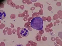 A promyelocyte (or progranulocyte) is a granulocyte precursor, developing from the myeloblast and developing into the myelocyte. Promyelocytes measure 12–20 microns in diameter. The nucleus of a promyelocyte is approximately the same size as a myeloblast but their cytoplasm is much more abundant.[1] They also have less prominent nucleoli than myeloblasts and their chromatin is more coarse and clumped.[1] The cytoplasm is basophilic and contains primary red/purple granules.[2]