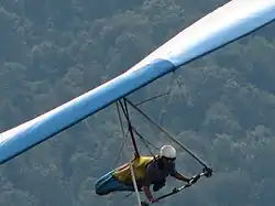 The prone position is also used to describe the way pilots and other crew may be positioned in an aircraft; lying on their stomachs rather than seated in a normal upright position.[6] During World War II, the bomb aimer in some bombers would be positioned this way to be better able to view the ground through a transparent panel or bubble in the nose of a bomber. Later, it was suggested that a pilot in the prone position might be more effective in some kinds of high-speed aircraft, because it would permit the pilot to withstand a greater g-force in the upward and downward direction with respect to the plane, and many speculative designs of the 1950s featured this arrangement.[7][8] However, it never became mainstream, as testing revealed that the increased difficulty of operating aircraft controls in the prone position outweighed the advantages. Three examples of this approach are seen in the Savoia-Marchetti SM.93, the Gloster Meteor F8 "Prone Pilot", and the Northrop XP-79. Modern hang gliders are typically piloted in the prone position.
