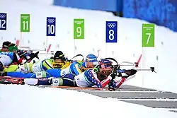 In Biathlon, prone is one of two positions that athletes shoot from during competition, the other being standing. In the prone position biathletes, set the their poles down to their side or rear, flip open their snow covers, load their rifle, and lay on a designated shooting mat at a designated lane to perform their shooting stage. Using a system of kneeling and removal of the rifle from the athletes back, the biathlete loads their rifle and takes off their poles all on this shooting mat at a designated shooting lane. Prone lanes are specified by a visual sign.[4], typically showing the position and an arrow. These lanes are typically assigned to the further half or right half of the range.[4]