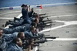 Prone position is often used in military combat as, like in competitive shooting, the prone position provides the best accuracy and stability (as well as making it more difficult for enemies to see the shooter or hit him/her with their own fire).