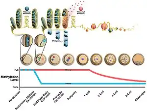 - ↑ 12.0 12.1 Jenkins TG, Carrell DT (2012). "Dynamic alterations in the paternal epigenetic landscape following fertilization". Frontiers in Genetics. 3: 143. doi:10.3389/fgene.2012.00143. PMC 3442791. PMID 23024648.