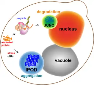 Most of the protein aggregates in yeast cells get refolded by molecular chaperones. However, some aggregates, such as the oxidatively damaged proteins or the proteins marked for degradation, cannot be refolded. Rather, there are two compartments that they can end up in. Protein aggregates can be localized at the Juxtanuclear quality-control compartment (JUNQ), which is near the nuclear membrane, or at the Insoluble Protein deposit (IPOD), near the vacuole in yeast cells.[13] Protein aggregates localize at JUNQ when they are ubiquitinated and targeted for degradation. The aggregated and insoluble proteins localize at IPOD as a more permanent deposition. There is evidence that the proteins here may be removed by autophagy.[20] These two pathways work together in that the proteins tend to come to the IPOD when the proteasome pathway is being overworked.[20]