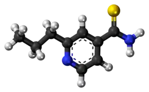 Common side effects include headache, metallic taste, dry mouth, and nausea.[1] Other side effects may include liver problems.[1] Alcohol should be avoided when it is used.[1] Safety in pregnancy and breastfeeding is unclear.[1] It is chemically similar to ethionamide.[2]