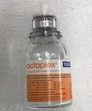 Prothrombin complex concentrate (PCC), also known as factor IX complex, is a medication made up of blood clotting factors II, IX, and X.[1] Some versions also contain factor VII.[5] It is used to treat and prevent bleeding in hemophilia B if pure factor IX is not available.[1][2] It may also be used in those with not enough of these factors due to other reasons such as warfarin therapy.[2] It is given by slow injection into a vein.[1]