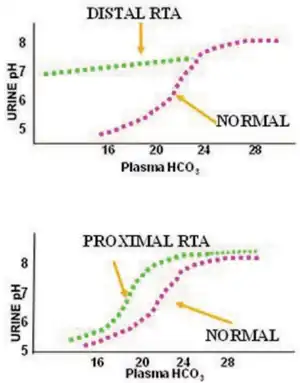 Proximal renal tubular acidosis (pRTA) or type 2 renal tubular acidosis (RTA) is a type of RTA caused by a failure of the proximal tubular cells to reabsorb filtered bicarbonate from the urine, leading to urinary bicarbonate wasting and subsequent acidemia. The distal intercalated cells function normally, so the acidemia is less severe than dRTA and the urine can acidify to a pH of less than 5.3.[1] pRTA also has several causes, and may occasionally be present as a solitary defect, but is usually associated with a more generalised dysfunction of the proximal tubular cells called Fanconi syndrome where there is also phosphaturia, glycosuria, aminoaciduria, uricosuria and tubular proteinuria.