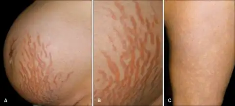 This rash usually begins with the skin looking abnormally red and feeling itchy, accompanied by notable swelling of skin tissue that appears raised and within the stretch marks.[7][8] Over time, individual segments of this rash can join to form one whole, larger rash with the same characteristics. As this happens, people report noticing the skin surrounding the rash to appear white in color (blanched) and in the shape of "halos". Multiple features of the disease can continue with time and have been reported as widespread erythema (a red skin rash due to damage of underlying capillaries) and patches of inflamed, itchy, rough, and cracked patches of skin that appear similarly to eczema.[8] Other features have been reported in some cases of those experiencing PUPPP, such as tiny vesicles, however these are not as common and develop after more time.