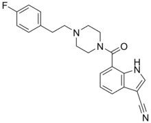 • N#Cc2c1cccc(c1[nH]c2)C(=O)N4CCN(CCc3ccc(F)cc3)CC4