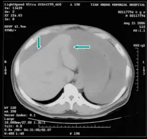 | Computed tomographic scan of an abdomen showing pseudomyxoma peritonei with multiple peritoneal masses (arrow) with "scalloping effect" seen. | |