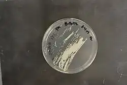 Pseudonocardia is a genus of the bacteria family Pseudonocardiaceae.[3] Members of this genus have been found living mutualistically on the cuticle of the leafcutter ants[4] because the bacteria has antibiotic properties that protect the fungus grown by the ants.[5] When they are grooming, their legs are passed over their mouth gland (metapleural gland) that produces the antibiotic and then their legs touch the fungi while they are walking around. The ants have metapleural glands that produce the antimicrobial components to eliminate the Escovopsis fungi. The bacteria may also be found in crypts on the propleural plate. Pseudonocardia is found to have antibiotic properties provided to the leaf-cutter ant to inhibit the growth of Escovopsis, which is a black yeast that parasitizes the leaf-cutter ant.[6]