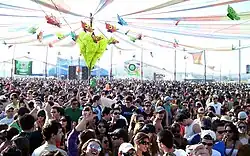 A psychedelic festival is a gathering that promotes psychedelic music and art in an effort to unite participants in a communal psychedelic experience.[47] Psychedelic festivals have been described as "temporary communities reproduced via personal and collective acts of transgression... through the routine expenditure of excess energy, and through self-sacrifice in acts of abandonment involving ecstatic dancing often fueled by chemical cocktails."[47] These festivals often emphasize the ideals of peace, love, unity, and respect.[47] Notable psychedelic festivals include the biennial Boom Festival in Portugal,[47] Ozora Festival in Hungary, Universo Paralello in Brazil as well as Nevada's Burning Man[48] and California's Symbiosis Gathering in the United States.[49]