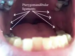The pterygomandibular raphe (pterygomandibular fold[1] or pterygomandibular ligament) is a thin[2] tendinous band of buccopharyngeal fascia. It is attached superiorly to the pterygoid hamulus of the medial pterygoid plate, and inferiorly to the posterior end of the mylohyoid line of the mandible. It gives attachment to the buccinator muscle (in front), and the superior pharyngeal constrictor muscle (behind).