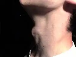 During puberty, changes in the larynx typically result in a decrease in pitch in both males and females. On average, the male voice deepens by one octave while the female voice lowers by a few semitones.[7] The fundamental frequency (pitch) of an adult female typically falls between 165 and 255 Hz and an adult male between 85 and 180 Hz.[8] Anatomical changes during puberty include enlargement of the larynx for both sexes. However, the larynx descends and grows significantly larger in males which often results in a visible laryngeal prominence on the neck (Adam's apple).[9] Additionally, male vocal folds become longer and thicker and resonant cavities become larger.[9] These changes contribute to a deepening of the voice characteristic of pubescent males.