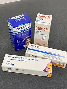 | Treatment | Permethrin or pyrethrin lotion[4] Combing to remove nits[4] Ivermectin (250 ug/kg) by mouth[4] Wash and dry clothing and bedding[4] |
