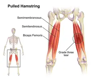 A pulled hamstring, is a strain of the hamstring, defined as an excessive stretch or tear of muscle fibers and related tissues. Hamstring injuries are common in athletes participating in many sports. Track and field athletes are particularly at risk, as hamstring injuries have been estimated to make up 29% of all injuries in sprinters.[1] Hamstring injuries can also come with a hip injury from sprinting. Symptoms for a hip injury are pain, aching and discomfort while running or any physical exercise.