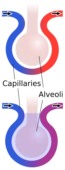 Normally, the ratio of ventilation to perfusion is about one-to-one; the volume of air entering the alveoli (ventilation) is about equal to that of blood in the capillaries around them (perfusion).[39] This ratio is reduced in pulmonary contusion; fluid-filled alveoli cannot fill with air, oxygen does not fully saturate the hemoglobin, and the blood leaves the lung without being fully oxygenated.[40] Insufficient inflation of the lungs, which can result from inadequate mechanical ventilation or an associated injury such as flail chest, can also contribute to the ventilation/perfusion mismatch.[30] As the mismatch between ventilation and perfusion grows, blood oxygen saturation is reduced.[40] Pulmonary hypoxic vasoconstriction, in which blood vessels near the hypoxic alveoli constrict (narrow their diameter) in response to the lowered oxygen levels, can occur in pulmonary contusion.[26] The vascular resistance increases in the contused part of the lung, leading to a decrease in the amount of blood that flows into it,[37] directing blood to better-ventilated areas.[26] Although reducing blood flow to the unventilated alveoli is a way to compensate for the fact that blood passing unventilated alveoli is not oxygenated,[26] the oxygenation of the blood remains lower than normal.[39] If it is severe enough, the hypoxemia resulting from fluid in the alveoli cannot be corrected just by giving supplemental oxygen; this problem is the cause of a large portion of the fatalities that result from trauma.[40]
