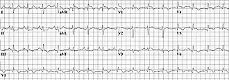The primary use of the ECG is to rule out other causes of chest pain.[62] An electrocardiogram (ECG) is routinely done on people with chest pain to quickly diagnose myocardial infarctions (heart attacks), an important differential diagnosis in an individual with chest pain. While certain ECG changes may occur with PE, none are specific enough to confirm or sensitive enough to rule out the diagnosis.[62] An ECG may show signs of right heart strain or acute cor pulmonale in cases of large PEs — the classic signs are a large S wave in lead I, a large Q wave in lead III, and an inverted T wave in lead III (S1Q3T3), which occurs in 12–50% of people with the diagnosis, yet also occurs in 12% without the diagnosis.[63][64]
