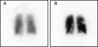 A ventilation/perfusion scan (or V/Q scan or lung scintigraphy) shows that some areas of the lung are being ventilated but not perfused with blood (due to obstruction by a clot).[17] This type of examination is as accurate as multislice CT, but is less used, due to the greater availability of CT technology. It is particularly useful in people who have an allergy to iodinated contrast, impaired kidney function, or are pregnant (due to its lower radiation exposure as compared to CT).[57][58][59] The test can be performed with planar two-dimensional imaging, or single photon emission tomography (SPECT) which enables three-dimensional imaging.[50] Hybrid devices combining SPECT and CT (SPECT/CT) further enable anatomic characterization of any abnormality.